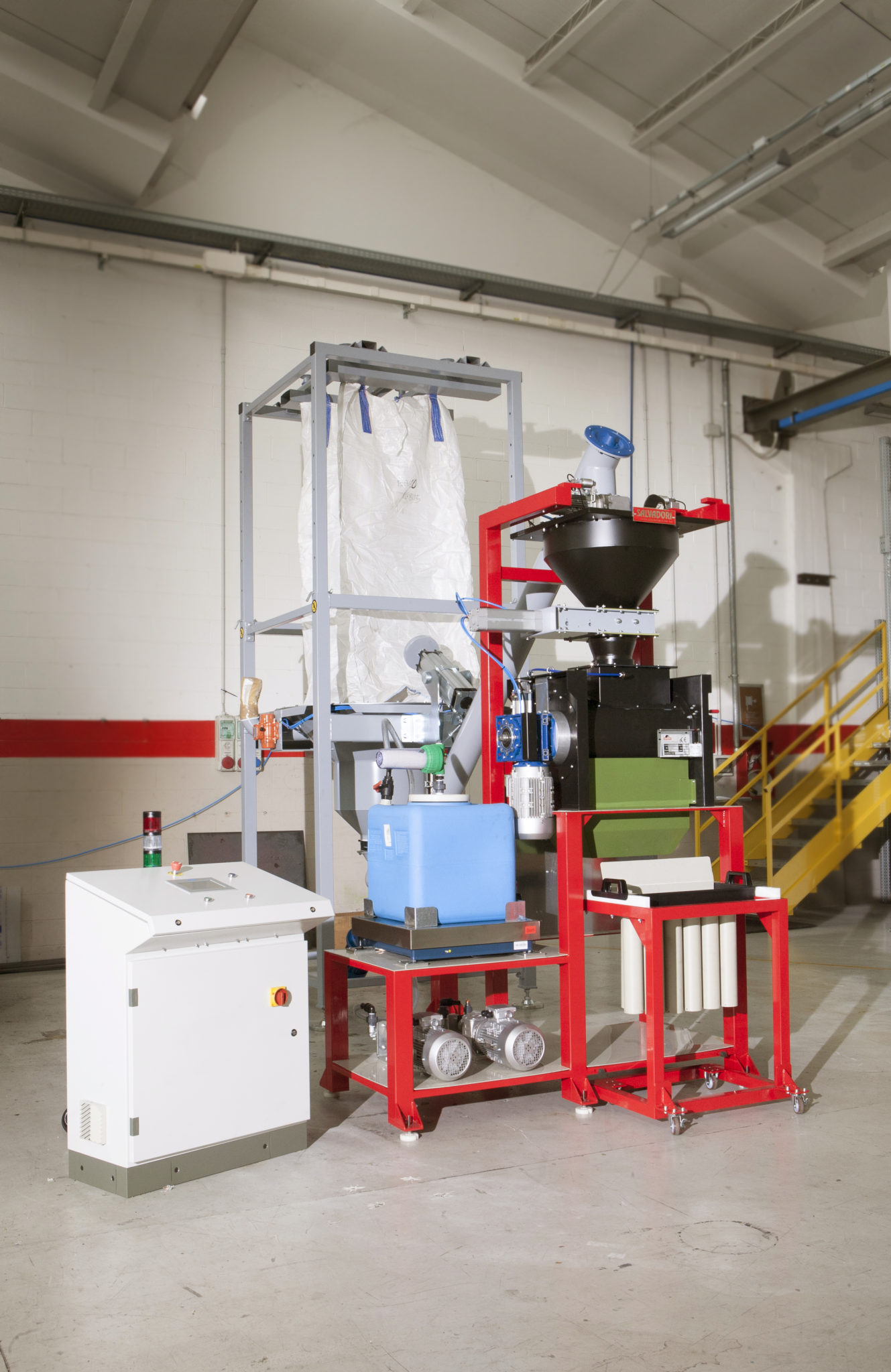Plant for the production of recycled rubber granule wheels. Based on the successful design of Salvadori double press and automatic batch mixer, this system integrates their qualities in a version designed for the production of recycled rubber wheels which can be used on light trolleys, waste bins, etc.